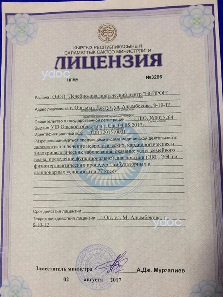 Клиника «Нейрон», Ош: 11 врачей, 1 отзыв о клинике и ее врачах, цены от 400 до 1200 сом., телефон, официальный сайт, адрес - Ош, ул. Музурбека Алымбекова, д. 8.